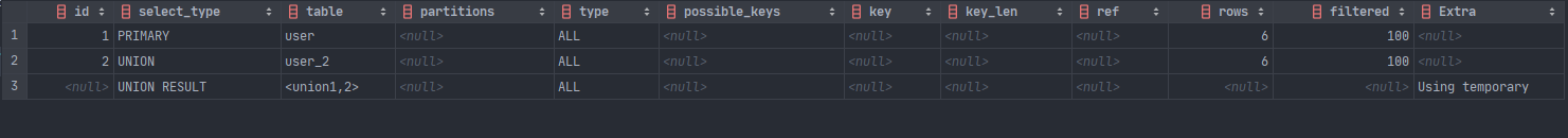 同时作为table进行引用,例如:<union1,2>,代表当前查询是由 id 为 1,2 表的并集查询结果