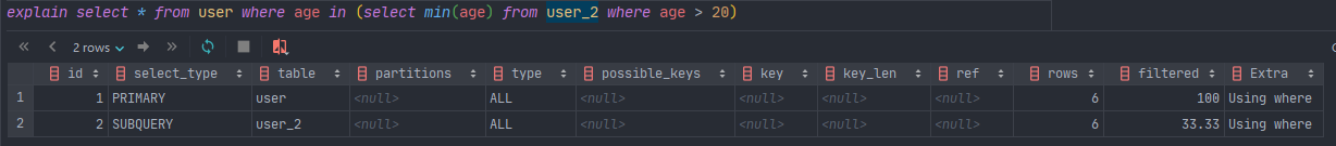 unique_subquery,eq_ref 查询一个分支,查询主键的子查询,例如: