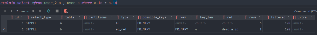 eq_ref,主键索引或非空唯一索引等值扫描,一般用在 join 查询过程,关联条件为主键或唯一索引,性能较好的join操作